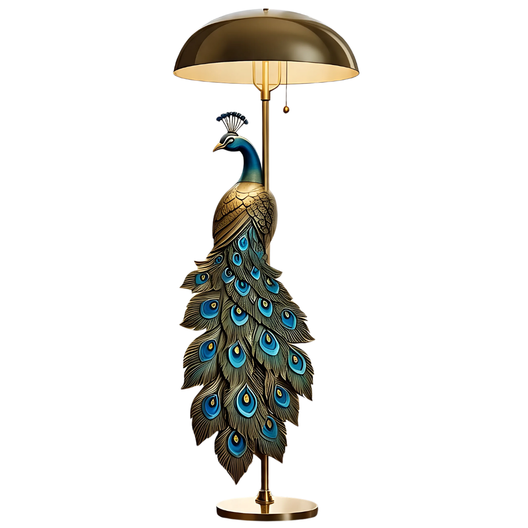 Bring a touch of royalty to your interiors with this Luxury Peacock Floor Lamp, a perfect blend of art and illumination. Designed with intricate detailing, the lamp features a majestic peacock sculpted with shimmering blue-green feathers and a golden finish. The dome-shaped shade adds a soft, warm glow to your space, enhancing its luxurious appeal.